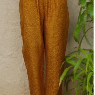 Disse bukser er skabt af nøje udvalgte indiske silkesarier, hvilket betyder, at hvert par bærer på sin egen historie og unikke mønsterkombination. Bukserne er designet i et afslappet pyjamas-snit, der forener ultimativ komfort med østlig elegance.