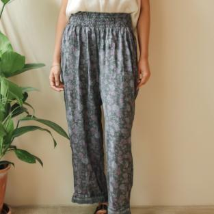 Disse bukser er skabt af nøje udvalgte indiske silkesarier, hvilket betyder, at hvert par bærer på sin egen historie og unikke mønsterkombination. Bukserne er designet i et afslappet pyjamas-snit, der forener ultimativ komfort med østlig elegance.