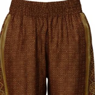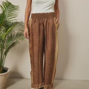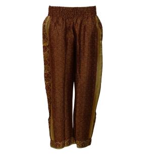 Disse bukser er skabt af nøje udvalgte indiske silkesarier, hvilket betyder, at hvert par bærer på sin egen historie og unikke mønsterkombination. Bukserne er designet i et afslappet pyjamas-snit, der forener ultimativ komfort med østlig elegance.