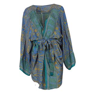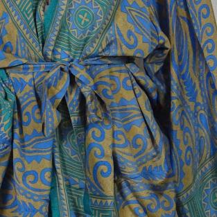 Flot kort kimono i genanvendt silkesari. Denne kimono er let og luftig, og meget behagelig at have på. Den har bælte i taljen og brede ærmer med et flot fald.