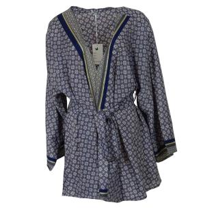 Flot kort kimono i genanvendt silkesari. Denne kimono er let og luftig, og meget behagelig at have på. Den har bælte i taljen og brede ærmer med et flot fald.