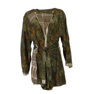 Flot kort kimono i genanvendt silkesari. Denne kimono er let og luftig, og meget behagelig at have på. Den har bælte i taljen og brede ærmer med et flot fald.