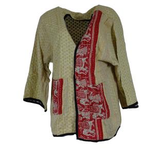 Denne smukke kantha jakke er syet af vintage indiske sarier og håndquiltet med den traditionelle kantha-stingteknik. Jakken har et let og afslappet fit, som gør den behagelig at have på idnendør som cardigan eller let jakke når det er lunt udenfor. Hver jakke er unik – der findes kun én med præcis dette mønster og farvespil. Den har en skøn boheme-fornemmelse og kan styles både med jeans, kjole, leggings eller som farverig cardigan i hverdagen.