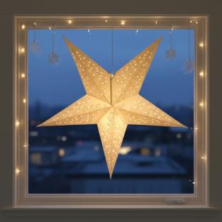 Flot papirstjerne til ophæng eller stander. Er smuk både med og uden lys, men giver et fantastisk smukt lys med en lille lampe i. Denne papirstjerne måler 40 cm og kan bruges til ophæng med eller uden lys. Skab hyggelig stemning i hjemmet med denne skønne stjernelampe produceret under Fair Trade forhold i Indien.