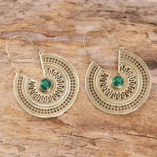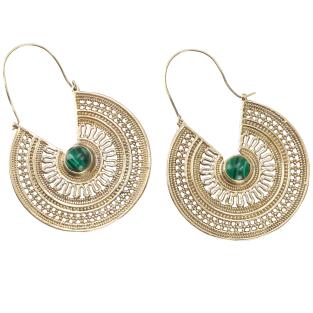 Indiske øreringe i tribal design med grøn malakit sten i midten. Øreringene er fremstillet af messing. Fair Trade smykker fra Indien.
